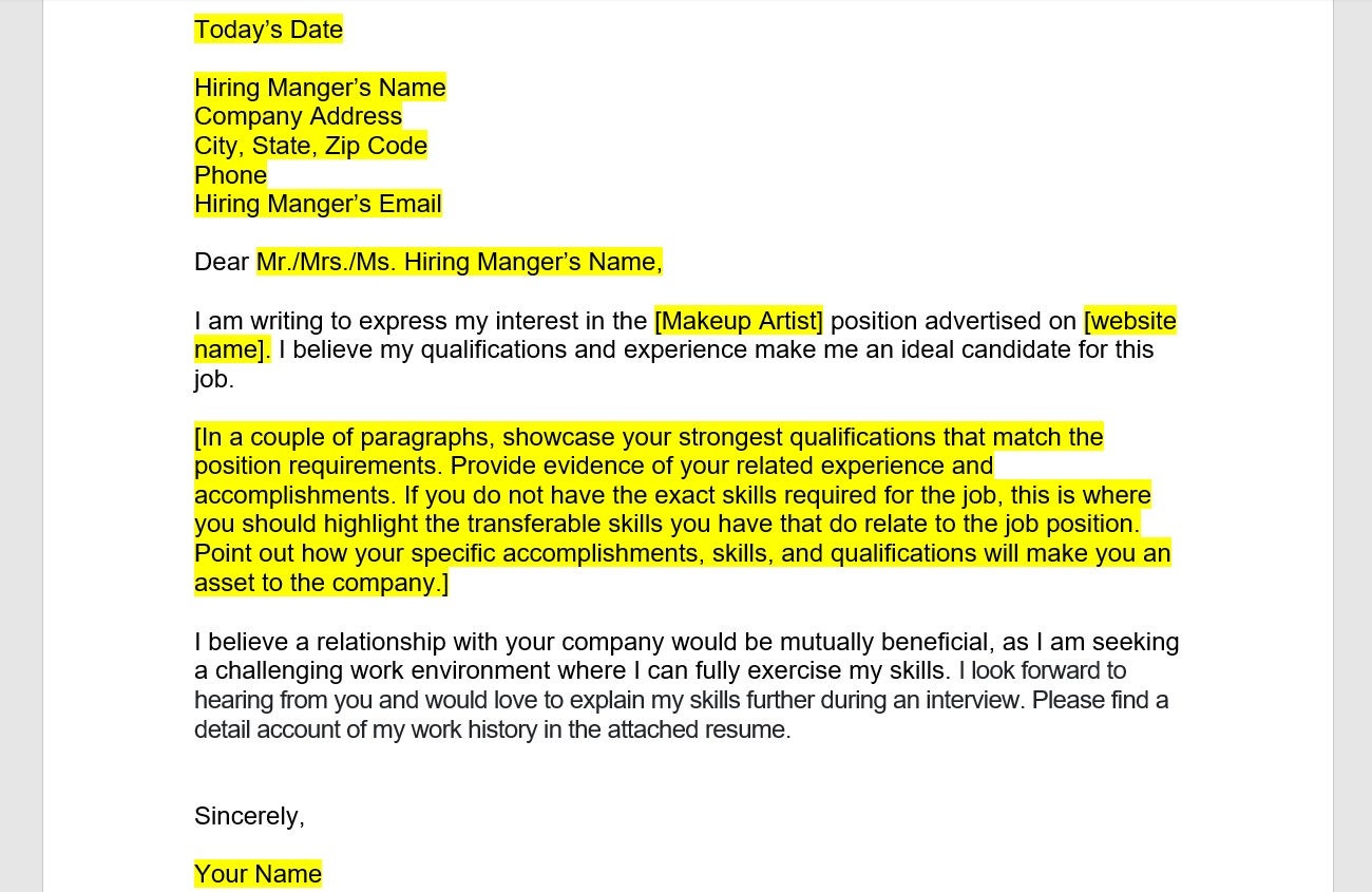 Esempi di lettere di presentazione per truccatori - Lettere di richiesta Esempio 1: lettera di presentazione del truccatore. Jenny Brown. 2699 Silver Street, App. 385. San Francisco, CA 54109. jenny@email.com. Giugno 30, 2022. Karen Walters. direttore. Trucco in più.