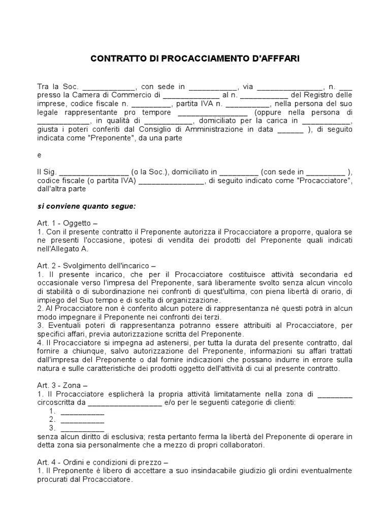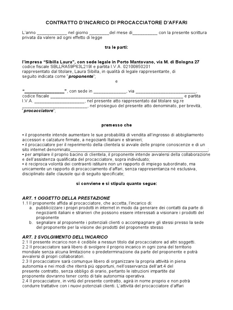 Procacciatore d’affari contratto fac simile - Vedi tutte le ... Fac simile lettera di incarico procacciatore d'affari Tra l'azienda (inserire dati dell'azienda), in persona del Legale Rappresentante Sig. (inserire dati del rappresentante legale) di seguito denominata "Società"