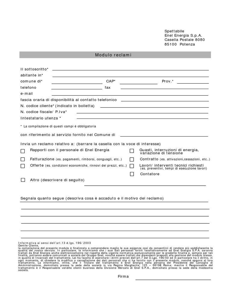 Modulo reclami Luce Inviare in una delle seguenti modalità: - dal sito Web: enel.it. - Posta: Enel Energia S.p.A. - Casella Postale. 8080 – 85100 Potenza (PZ). Dati del Cliente. Reclami Enel Energia: richieste e moduli rimborso Una volta compilato il modulo online in tutti i suoi campi e confermati i dati inseriti, sarà possibile procedere all'invio della richiesta di reclamo in un ...