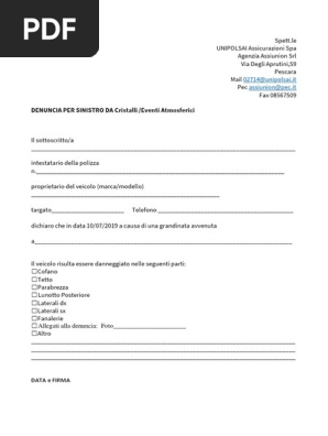 PDF Denuncia Per Sinistro Da Grandine DENUNCIA PER SINISTRO DA GRANDINE Io sottoscritto/a , intestatario della polizza n. , proprietario del veicolo (marca/modello) , targato , dichiaro che in data , a causa di una grandinata avvenuta a , provincia , la mia vettura ha subito danni alla carrozzeria. Il veicolo risulta essere danneggiato nelle seguenti parti: ☐ Cofano ☐ Tetto PDF Denuncia Sinistro Grandine - StormSolution S.r.l Dichiaro inoltre che il veicolo di mia proprietà al momento dell'evento risultava conforme a tutti gli eventuali accessori obblighi previsti da polizza. Assicurazione Grandine Auto: cos'è e quando richiedere i danni - Facile.it Per ottenere il risarcimento dei danni causati da una grandinata che ha ammaccato l'auto (ma le precipitazioni più violente possono provocare pure la rottura del parabrezza e/o del lunotto, roba di migliaia di euro di danni) bisogna innanzitutto attendere che l'evento si verifichi.